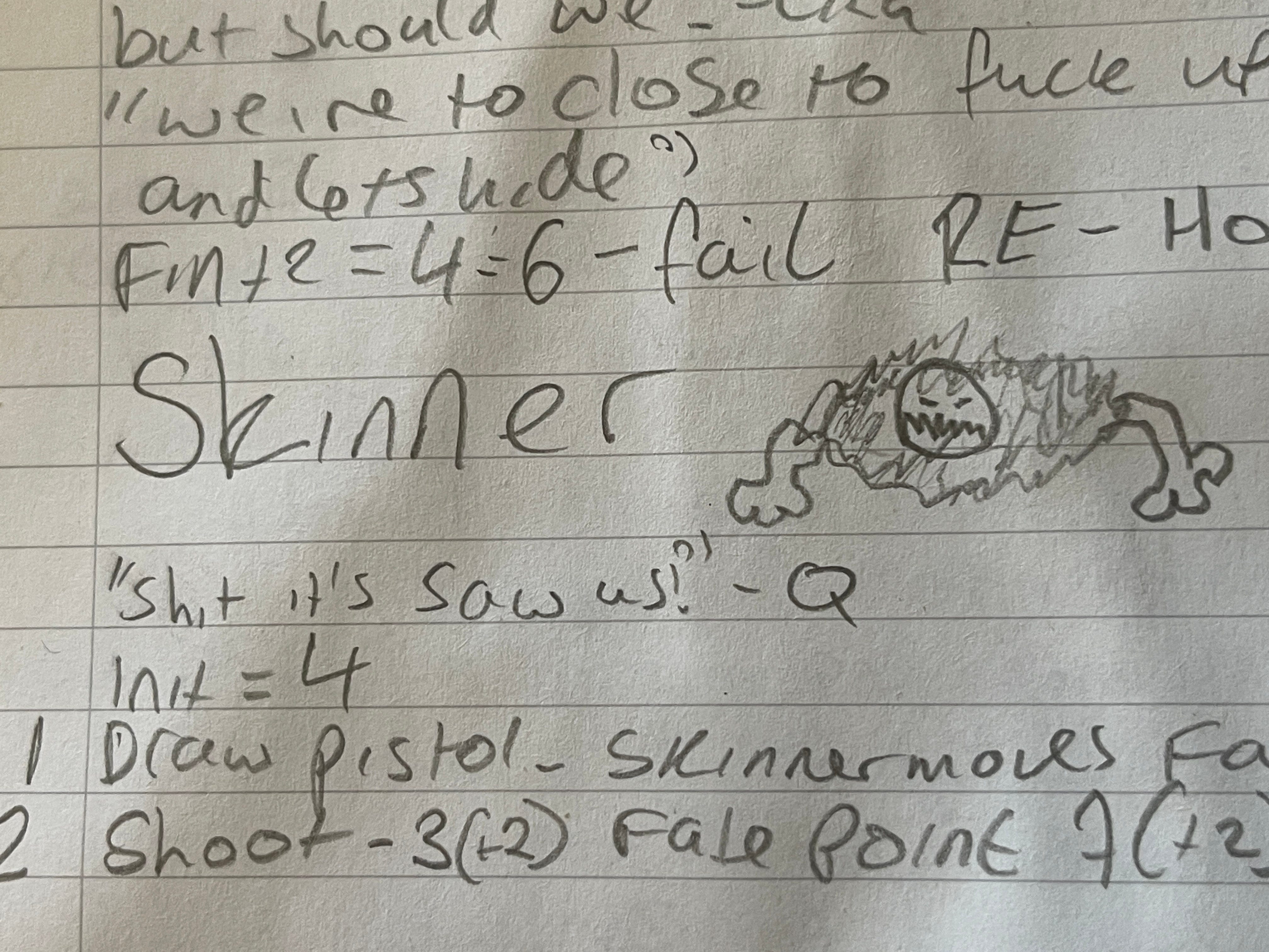 Skinner Reaction - Double 1, hostileThey kicked out the fire and hunkered down, Lina shivering slightly in her small clothes. She had wanted to pull on her leathers, but the Skinner had finished its ruminating and had wandered closer, so she stayed low. She saw the flicker of it’s dead, reflective eyes a moment before it sniffed the air and let out an ear piercing shriek.